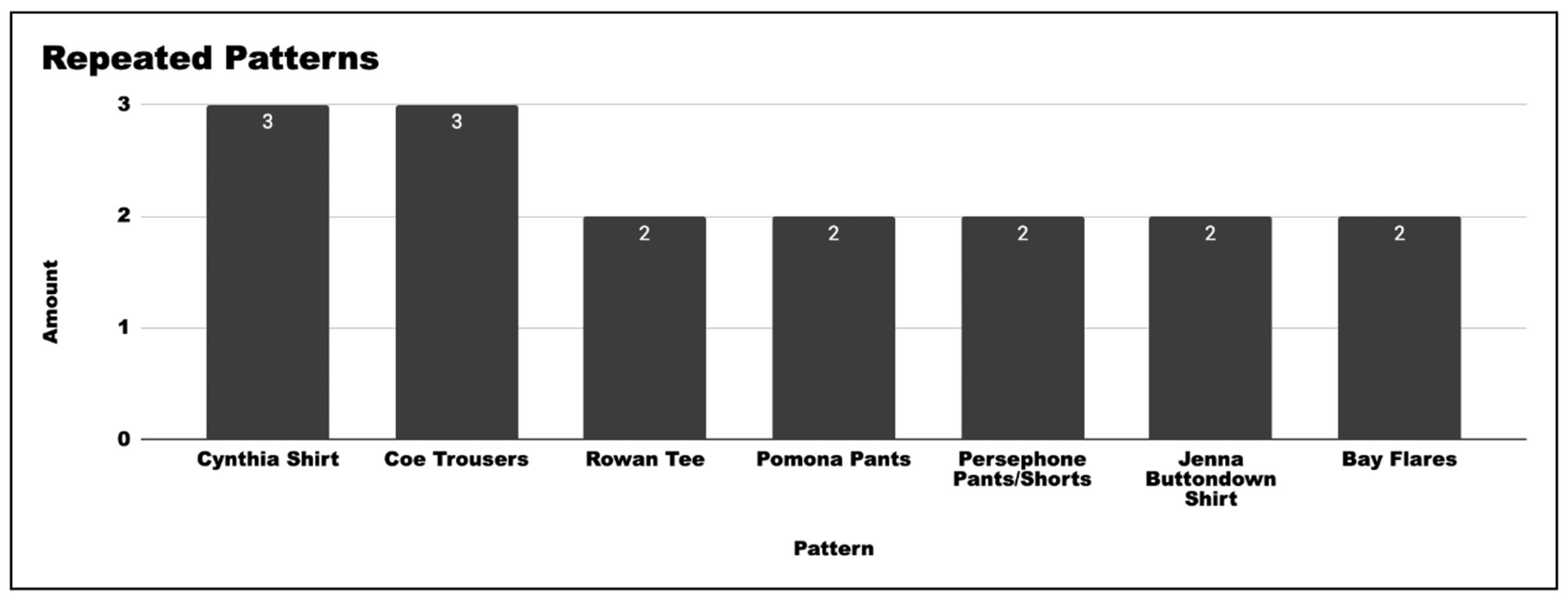 I purchased 11 patterns and made 5, which is a make rate of slightly less than 50%. Unmade patterns are a result of planning too far out — often related to ordering multiple A0 prints at once for the savings. Not included in the chart below are 3 patterns gifted for testing, for which my make rate is 100%.