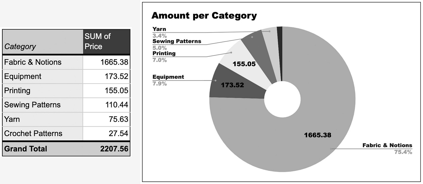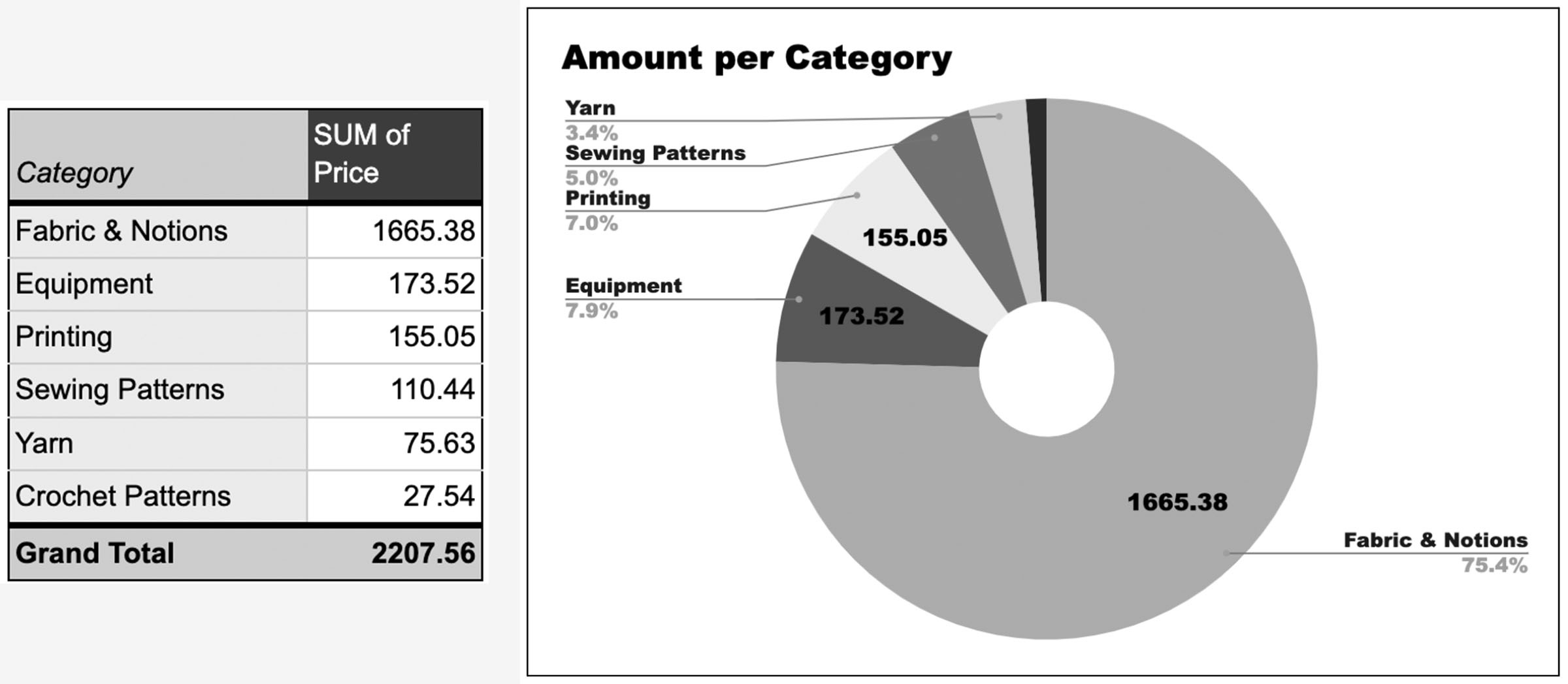 For the past few years, I've logged data on my sewing (and crochet) projects with increasing granularity. This year, I finally tracked dollars spent.