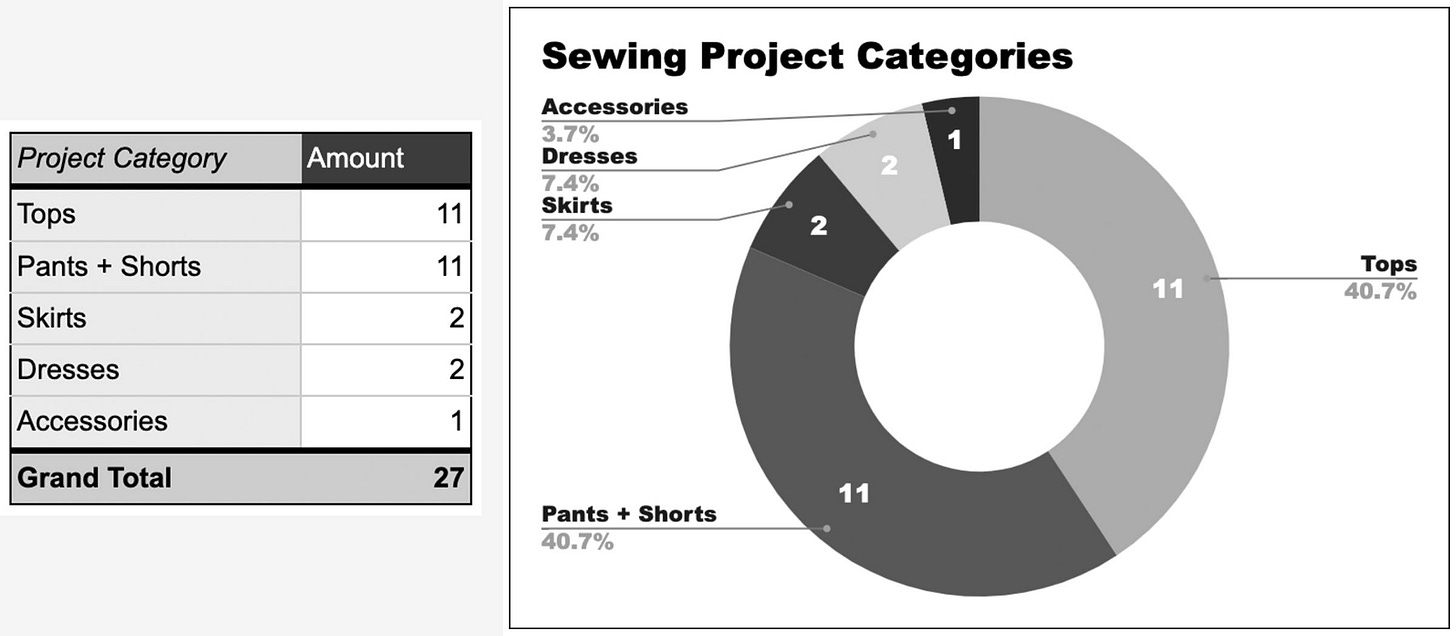 Below, see the category breakdown for sewing project categories, two ways. I made a total of 27 projects for a year-over-year increase of 35%. This is an average rate of 2.25 projects per month. For my schedule, a consistent output of 2-3 garments per month is a steady, sustainable pace that mitigates the risk of burnout.